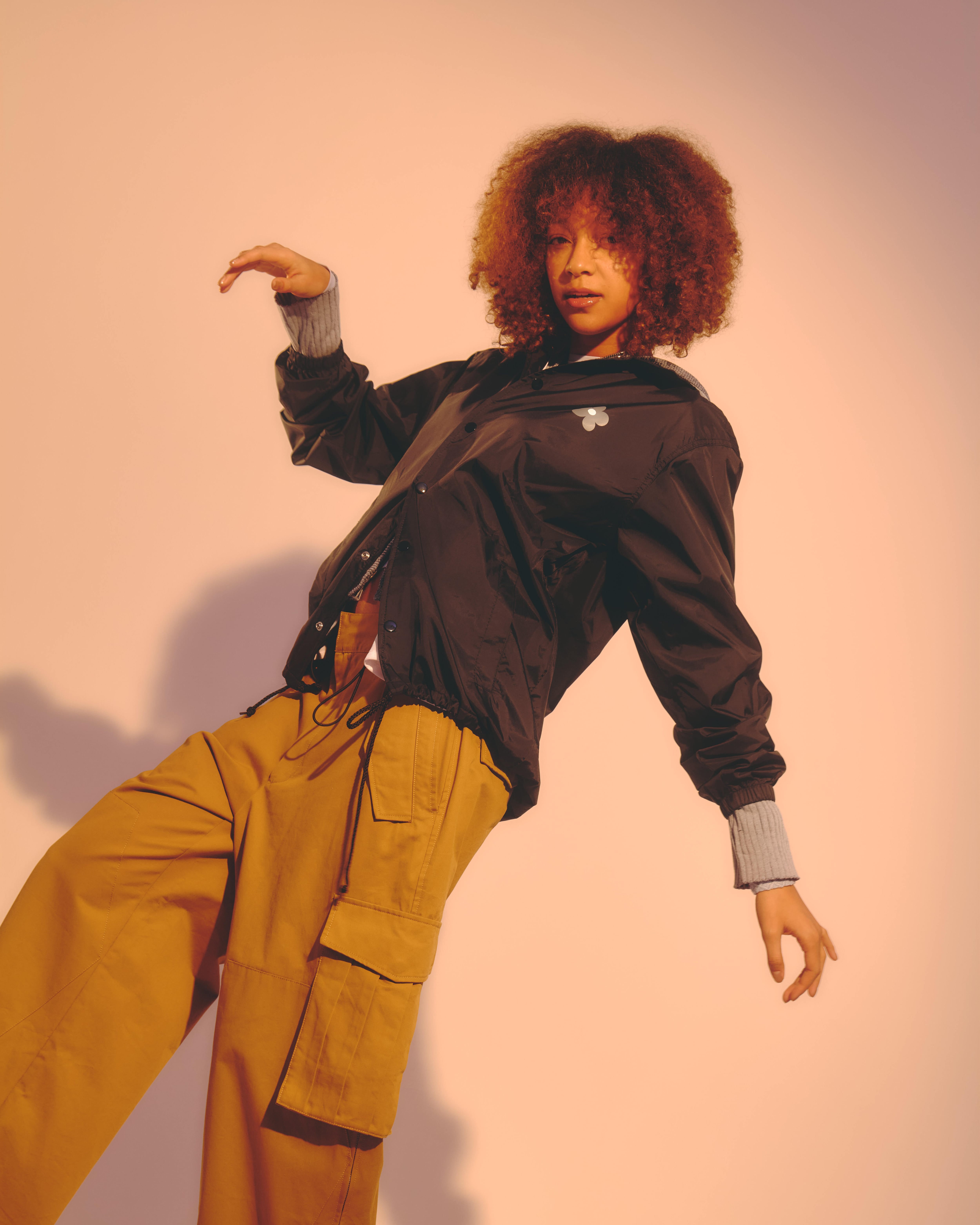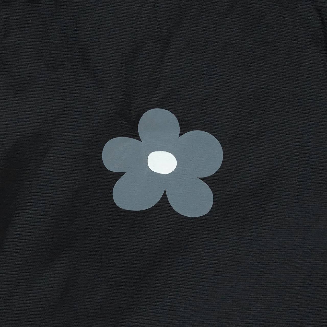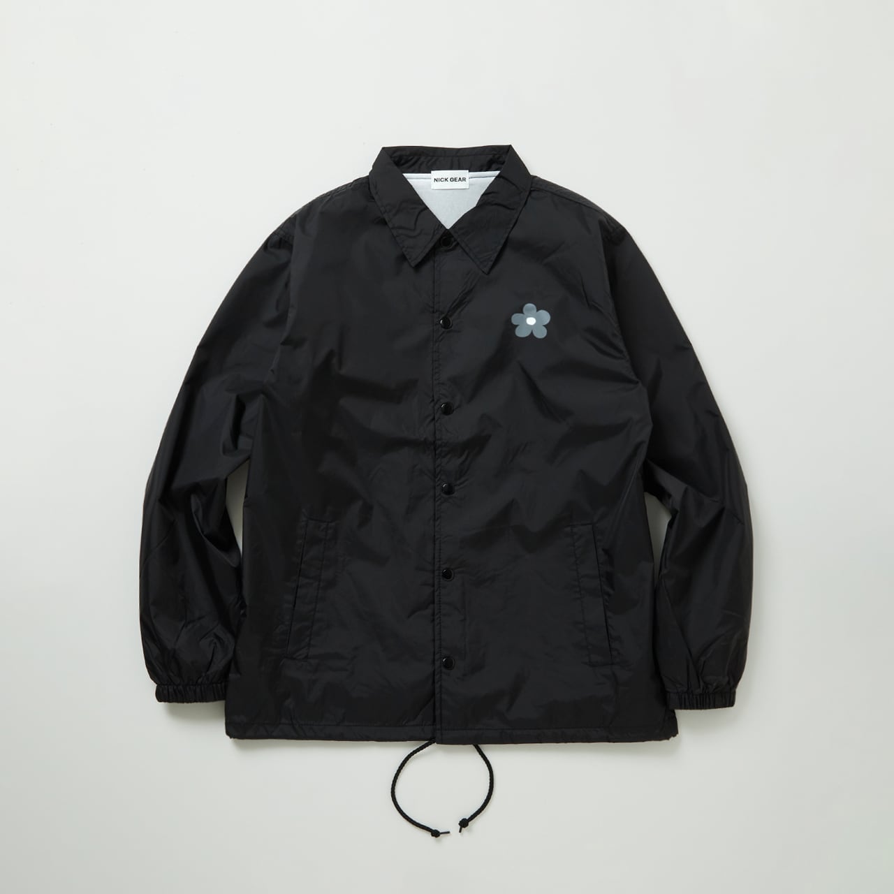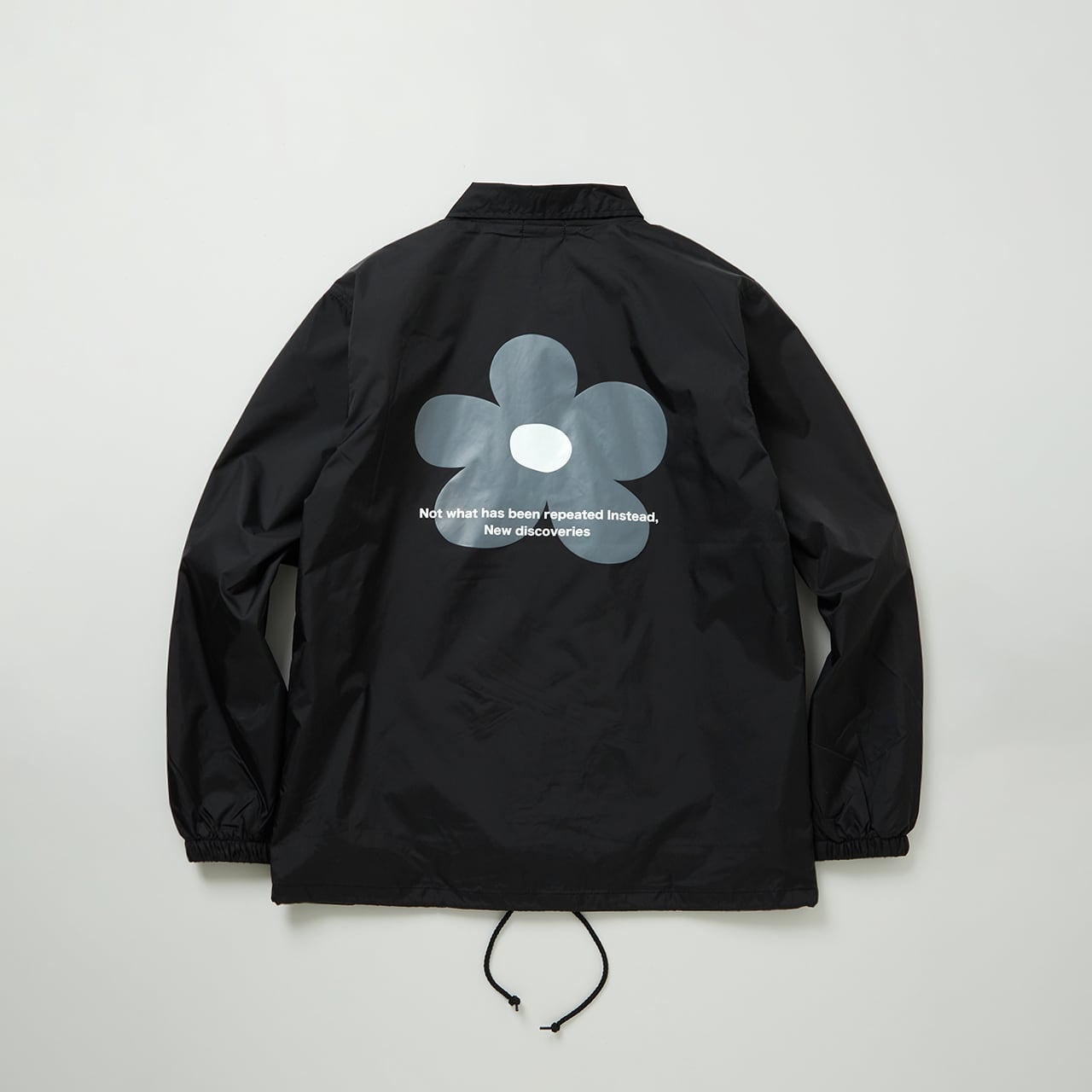 フロントはシンプルに、バックは大胆にグラフィックとメッセージをプリント(シルクスクリーン)で施したコーチジャケット。