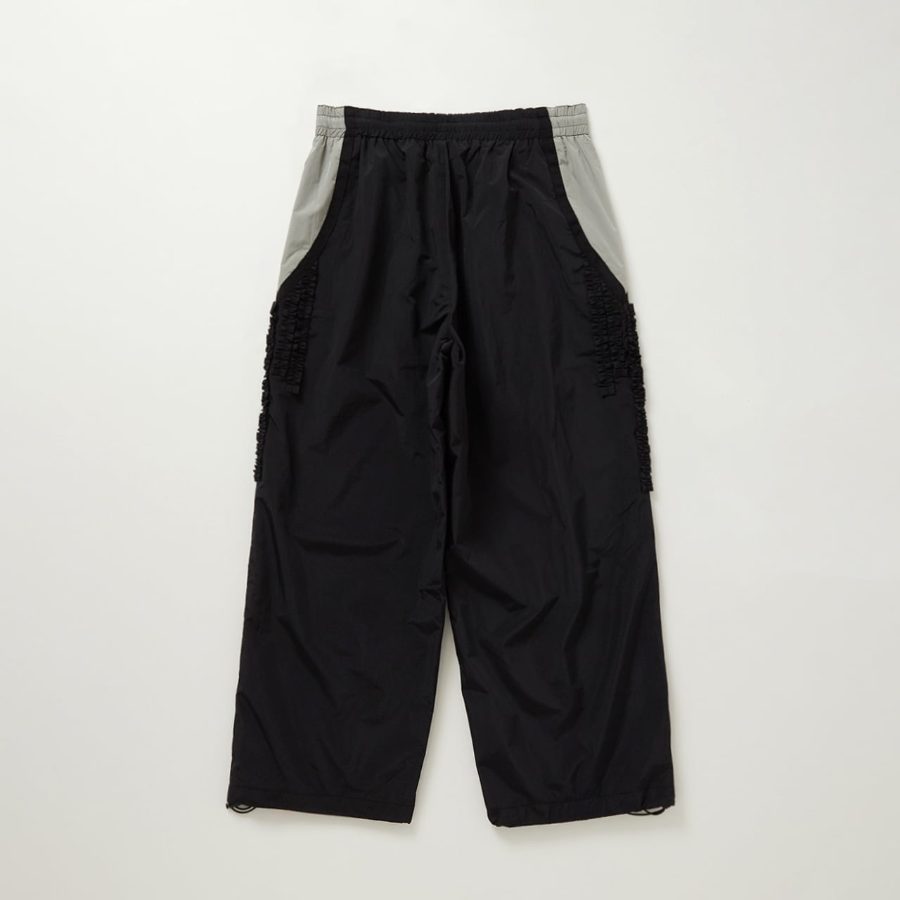 生地の切り替えしとポケット下のフリルが特徴的なナイロンパンツ。