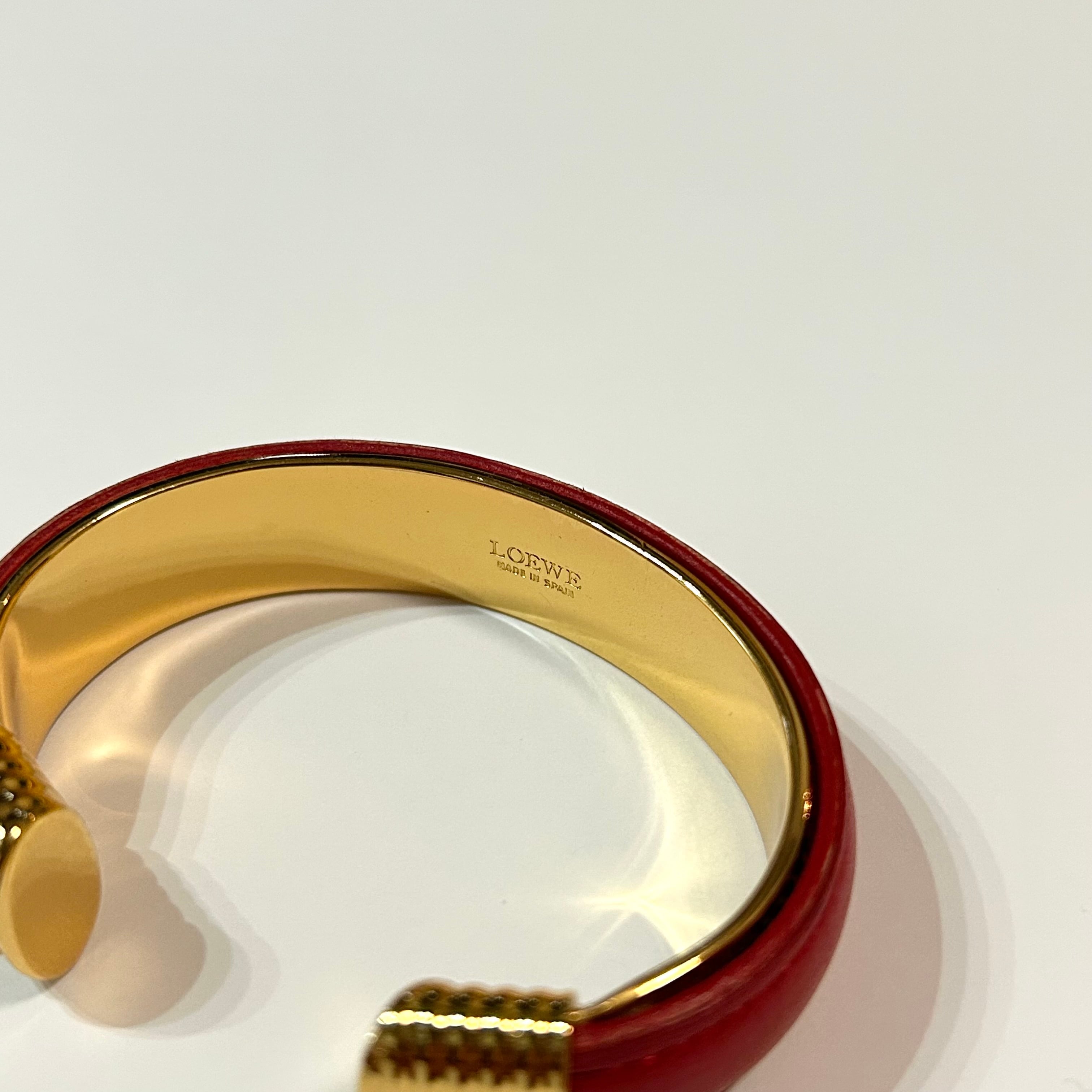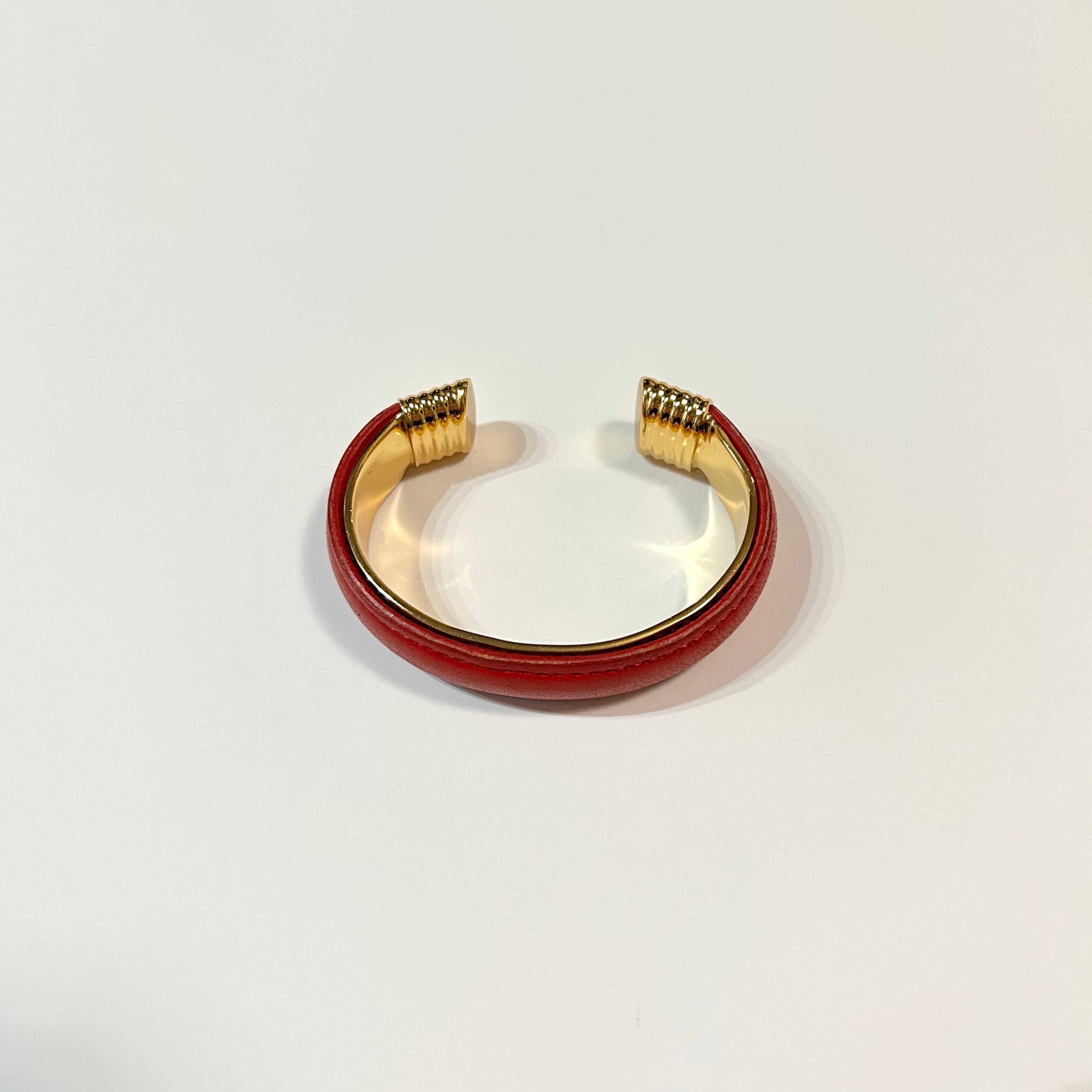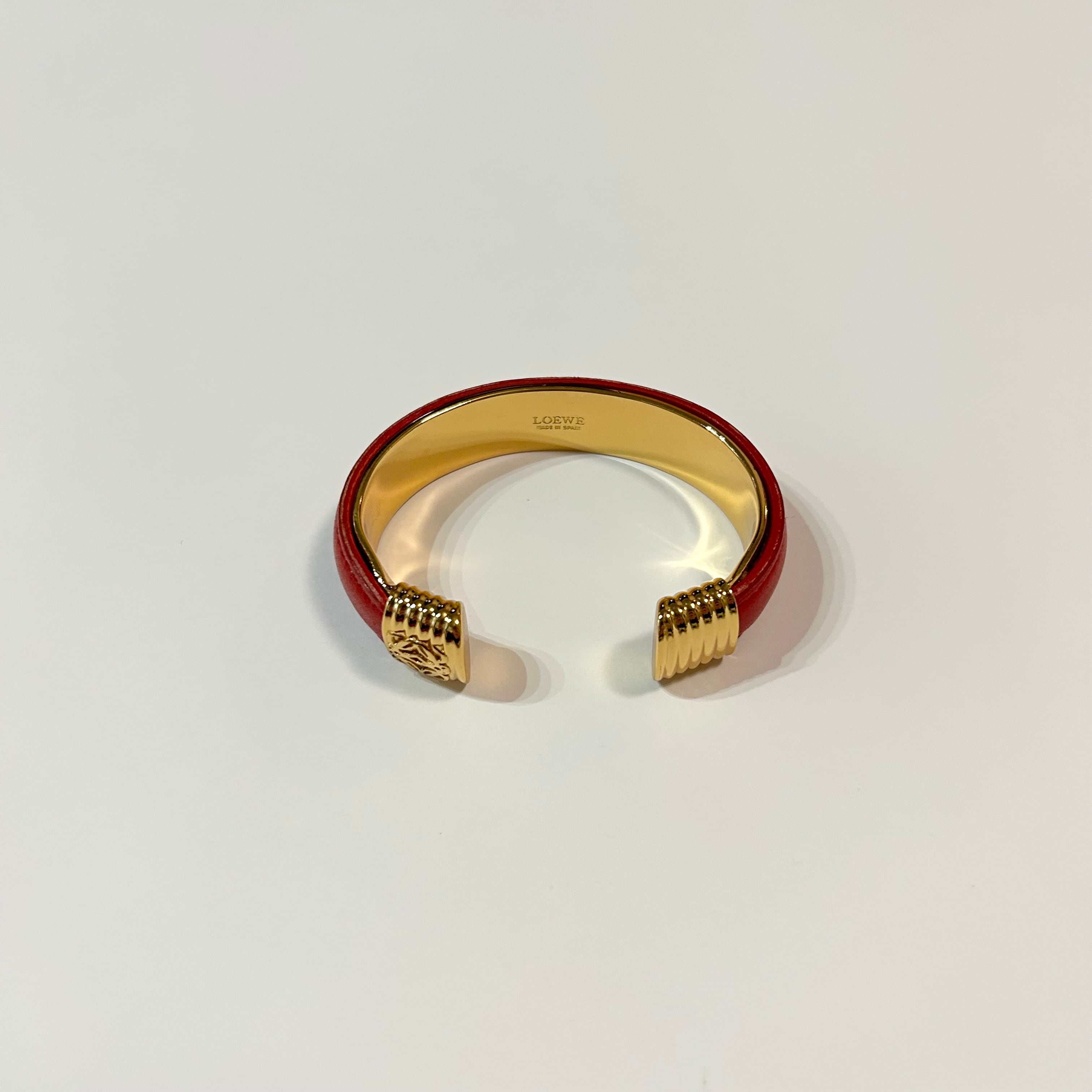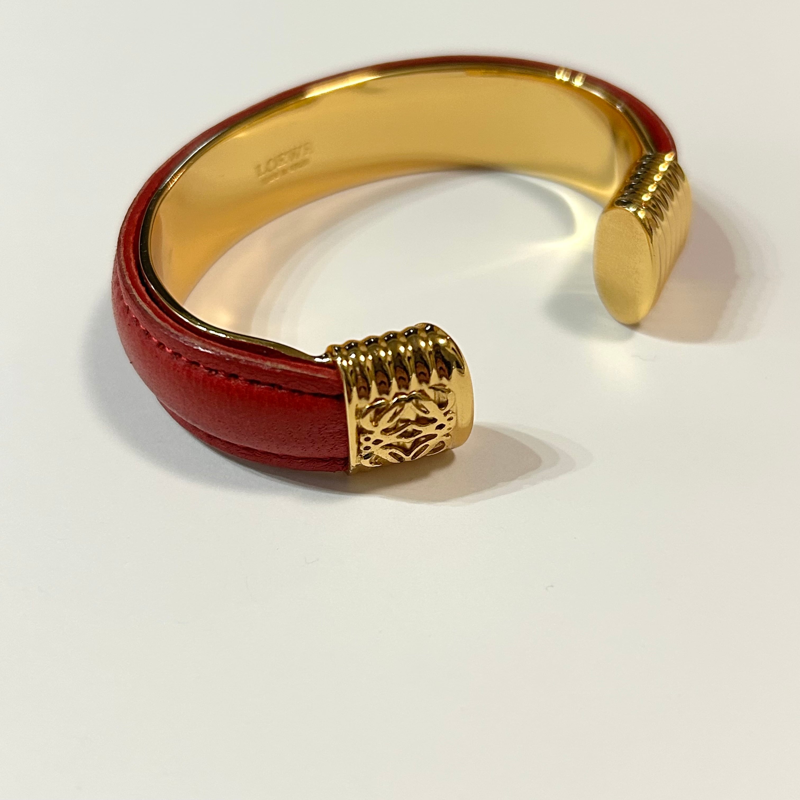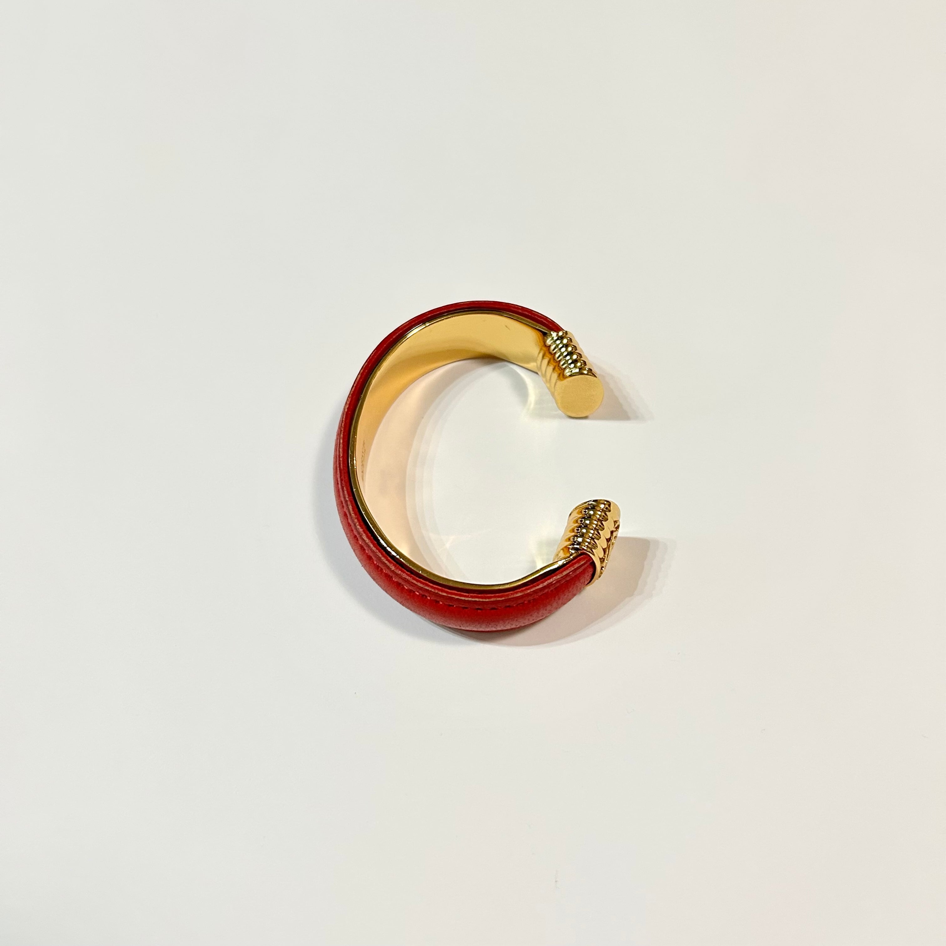 レッドレザーとゴールド(真鍮)の組み合わせが上品です。程よい重厚感があり質の良さがうかがえます。ロゴも当時のロゴで内側に刻印がございます。レザーや真鍮部分に劣化はなく未使用に近い美品です。バングルタイプですので多少の調節可能です。箱には多少の劣化がございますが、貴重な箱付きです。