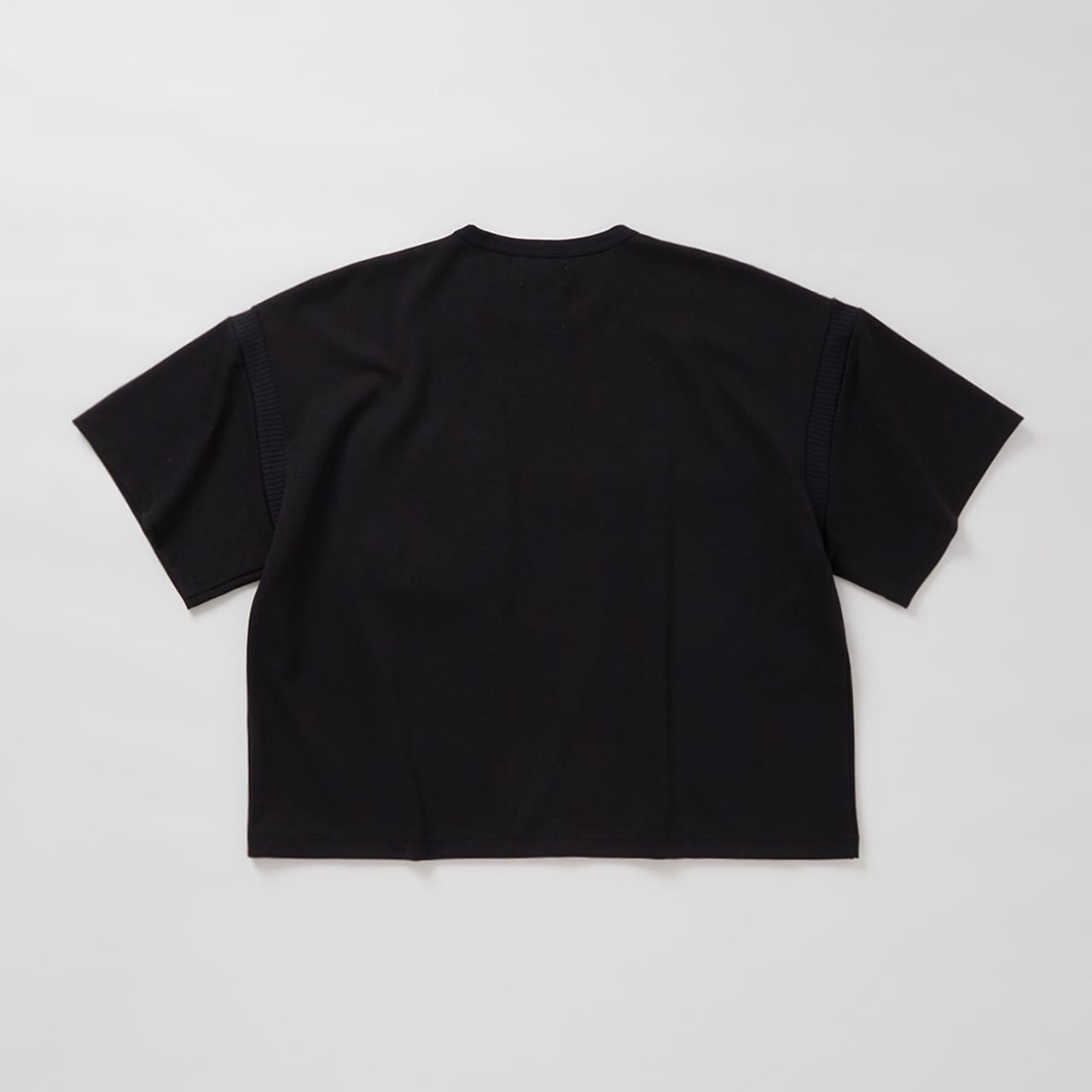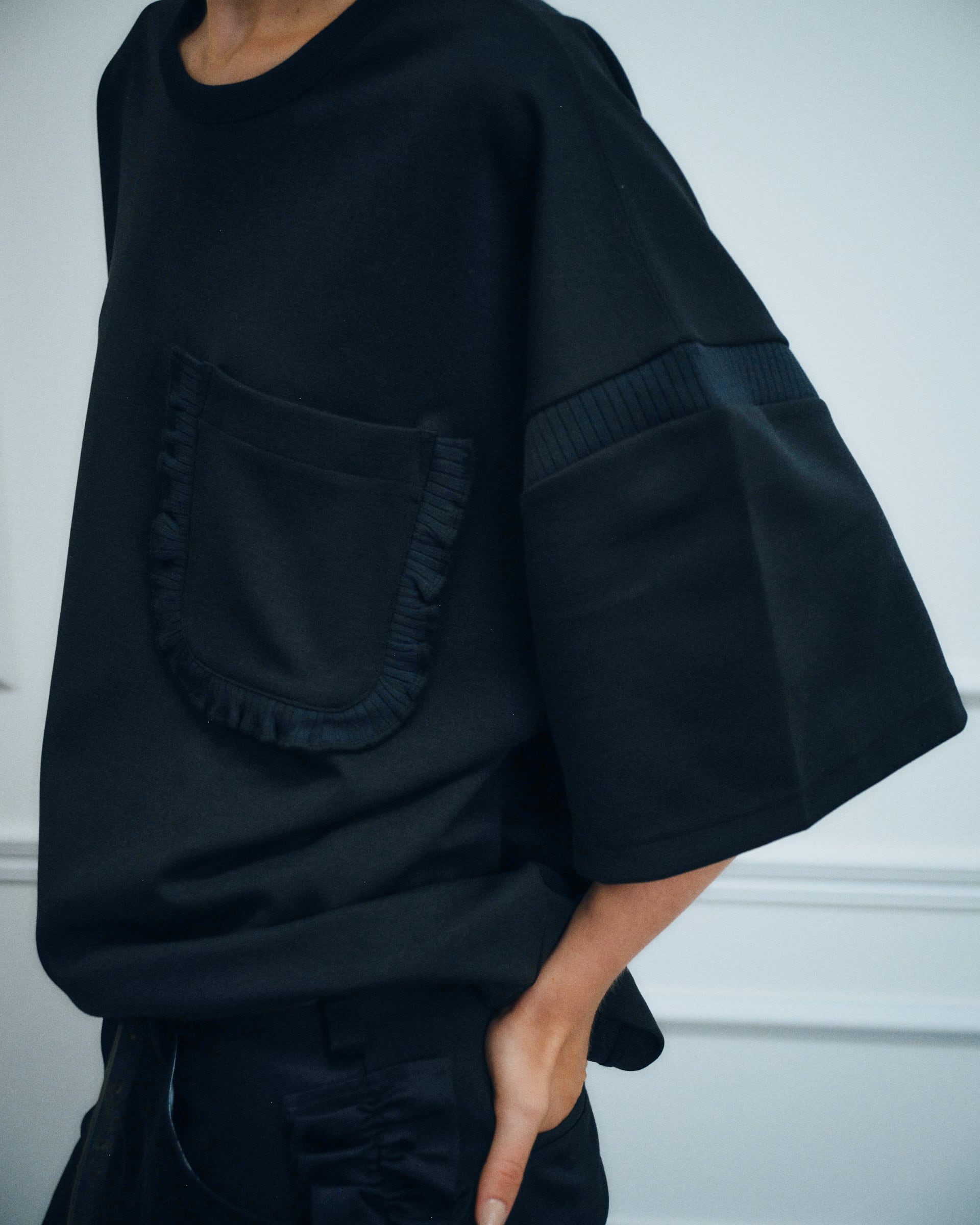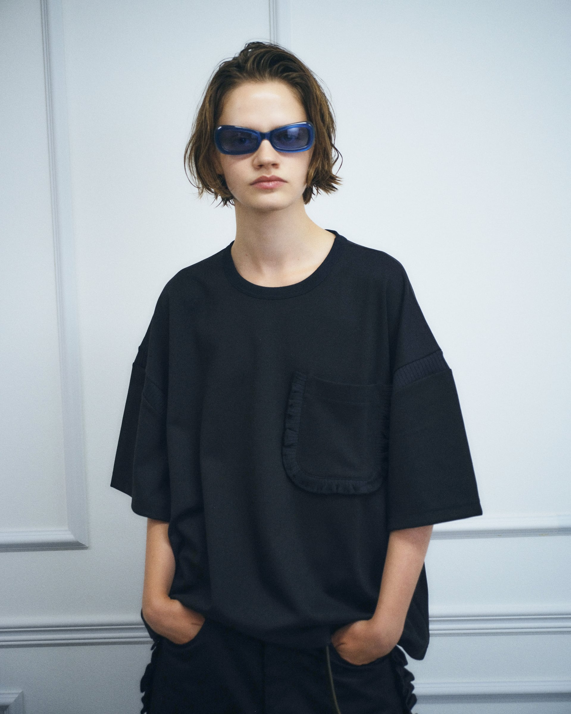 “袖のリブ”と”ポケットのリブ”が特徴的なTシャツ。ボディはスポーティさに加え上品さも兼ね揃えたポンチ素材を採用。ポケットにはブランドの特徴であるフリルをリブで表現。ギミック感のある袖のリブとボディが、一見フリルと交わらないようで上手く調和する。