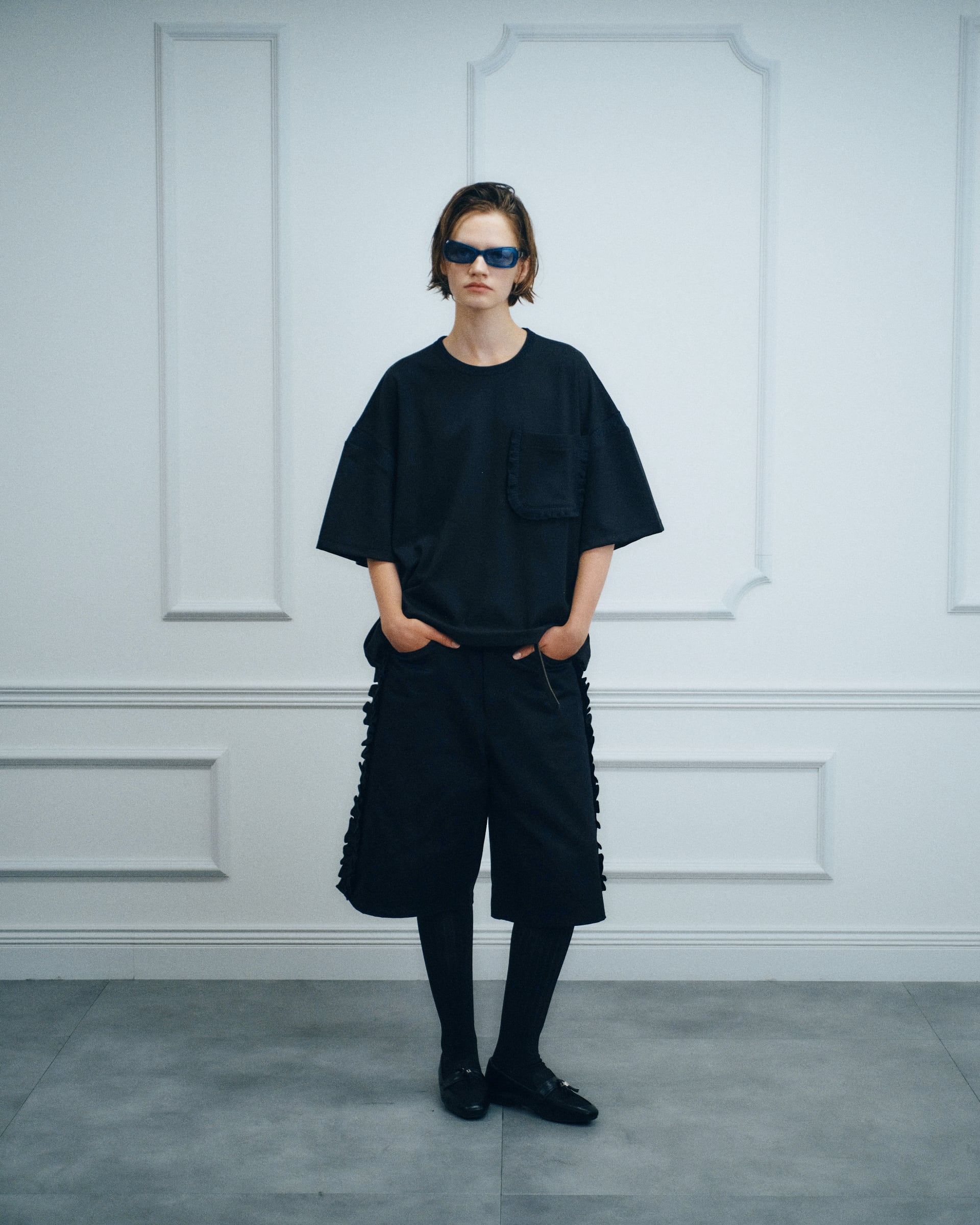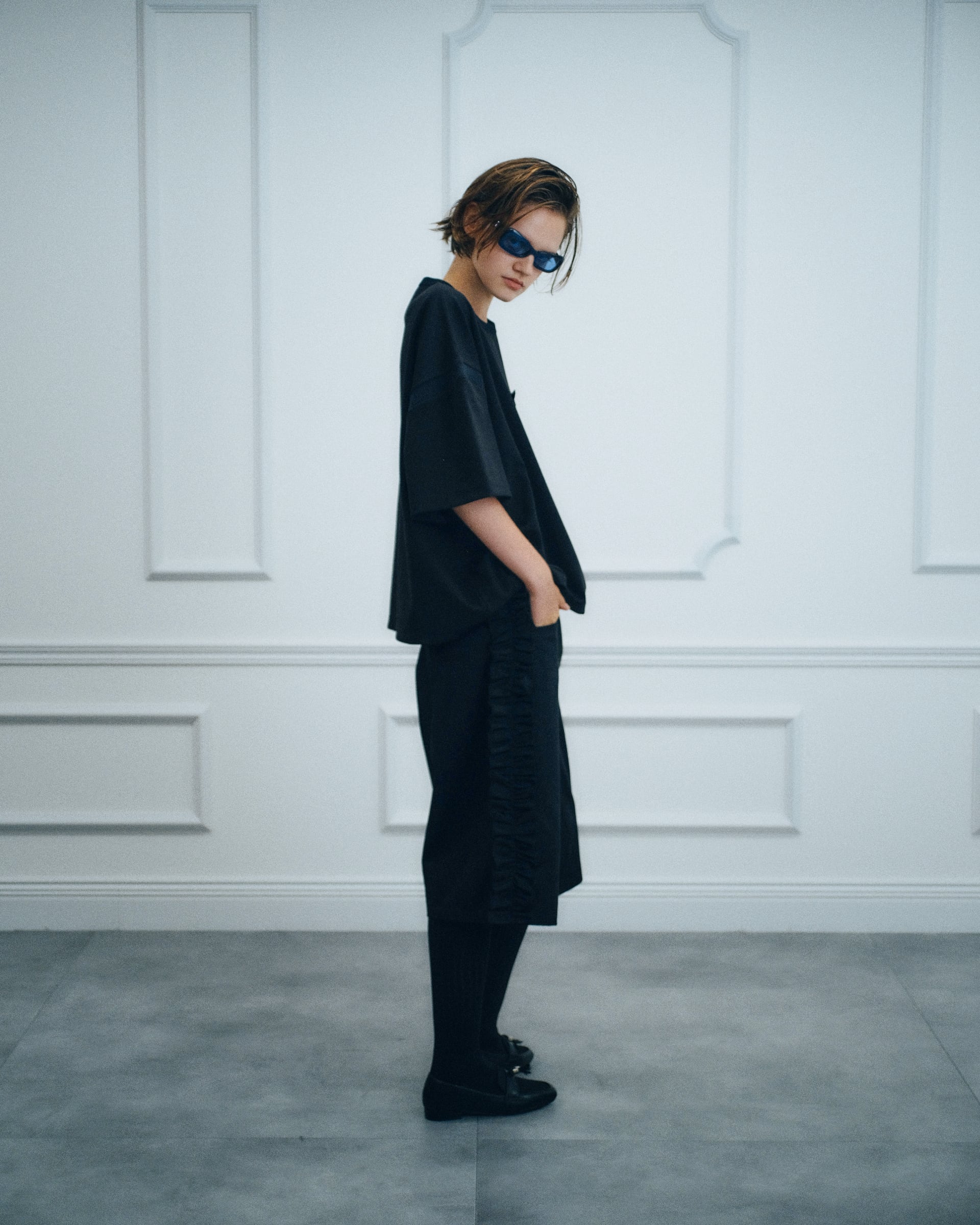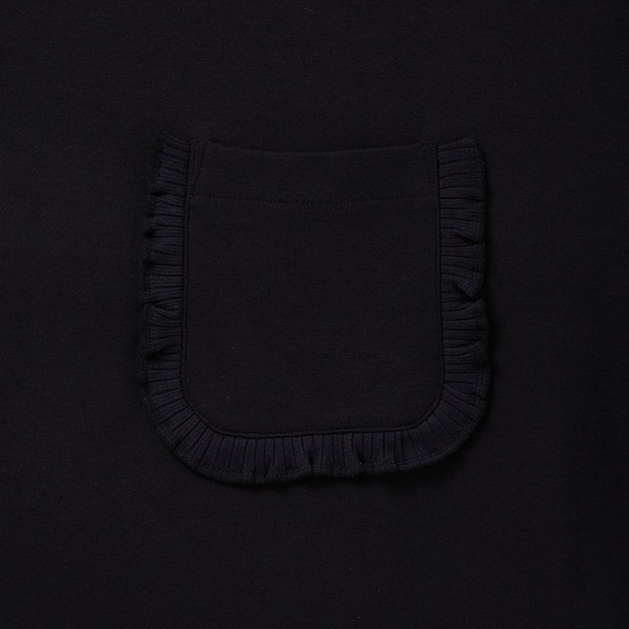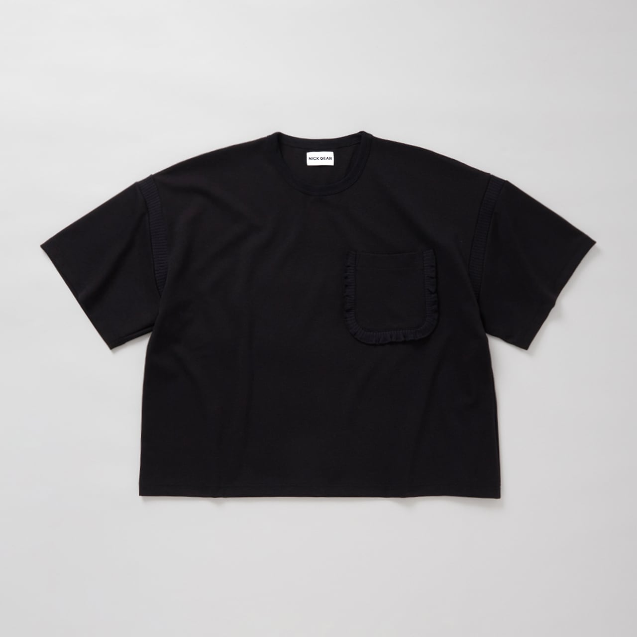 “袖のリブ”と”ポケットのリブ”が特徴的なTシャツ。ボディはスポーティさに加え上品さも兼ね揃えたポンチ素材を採用。ポケットにはブランドの特徴であるフリルをリブで表現。ギミック感のある袖のリブとボディが、一見フリルと交わらないようで上手く調和する。