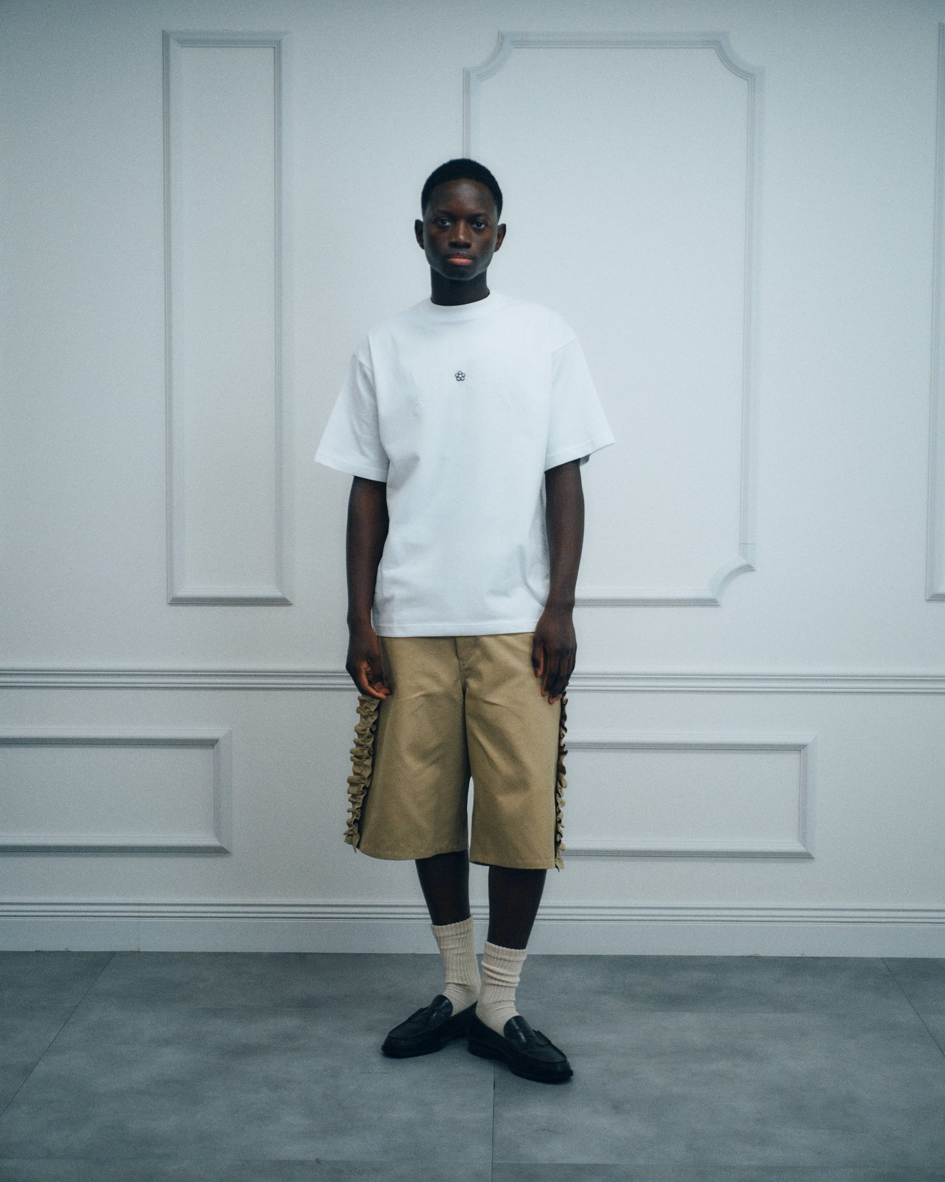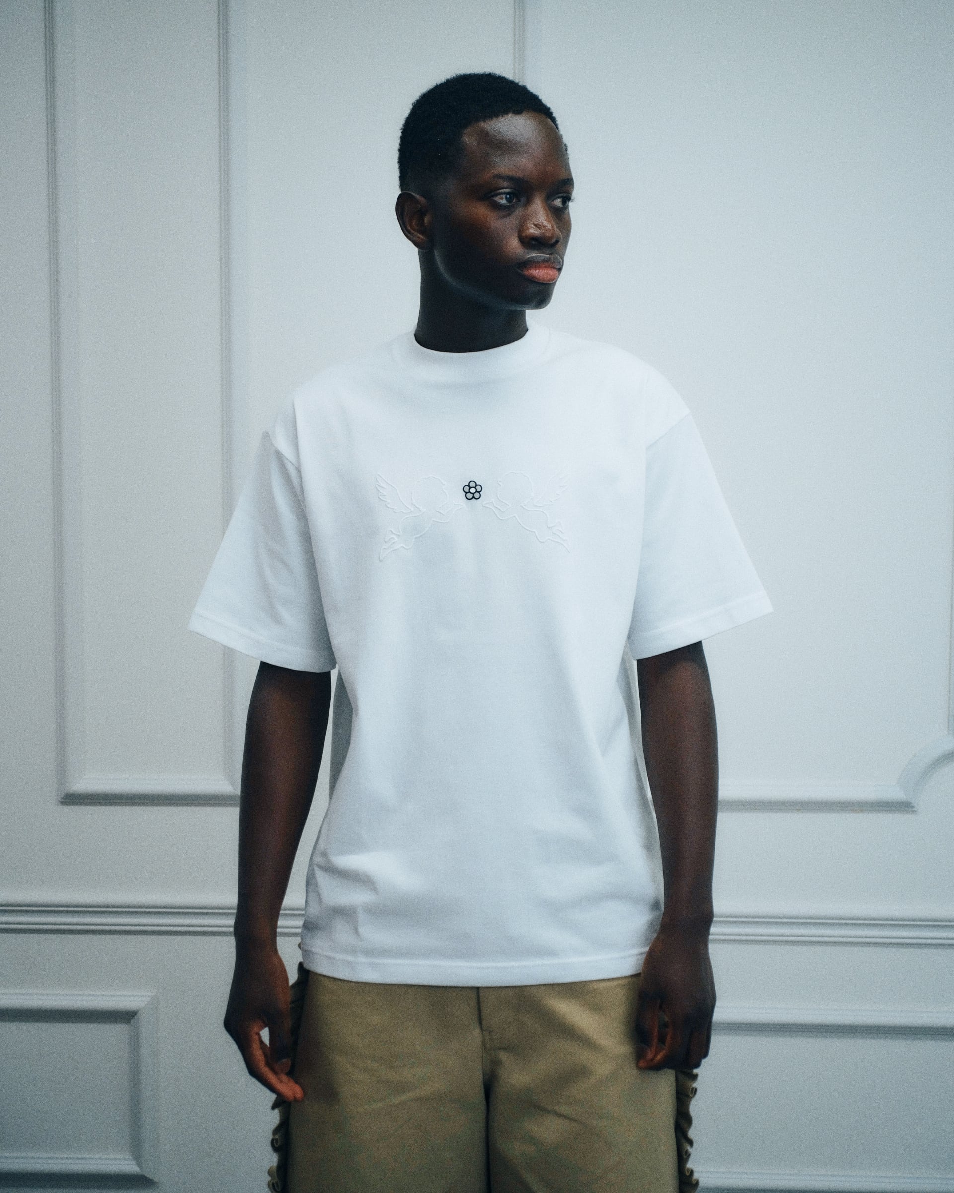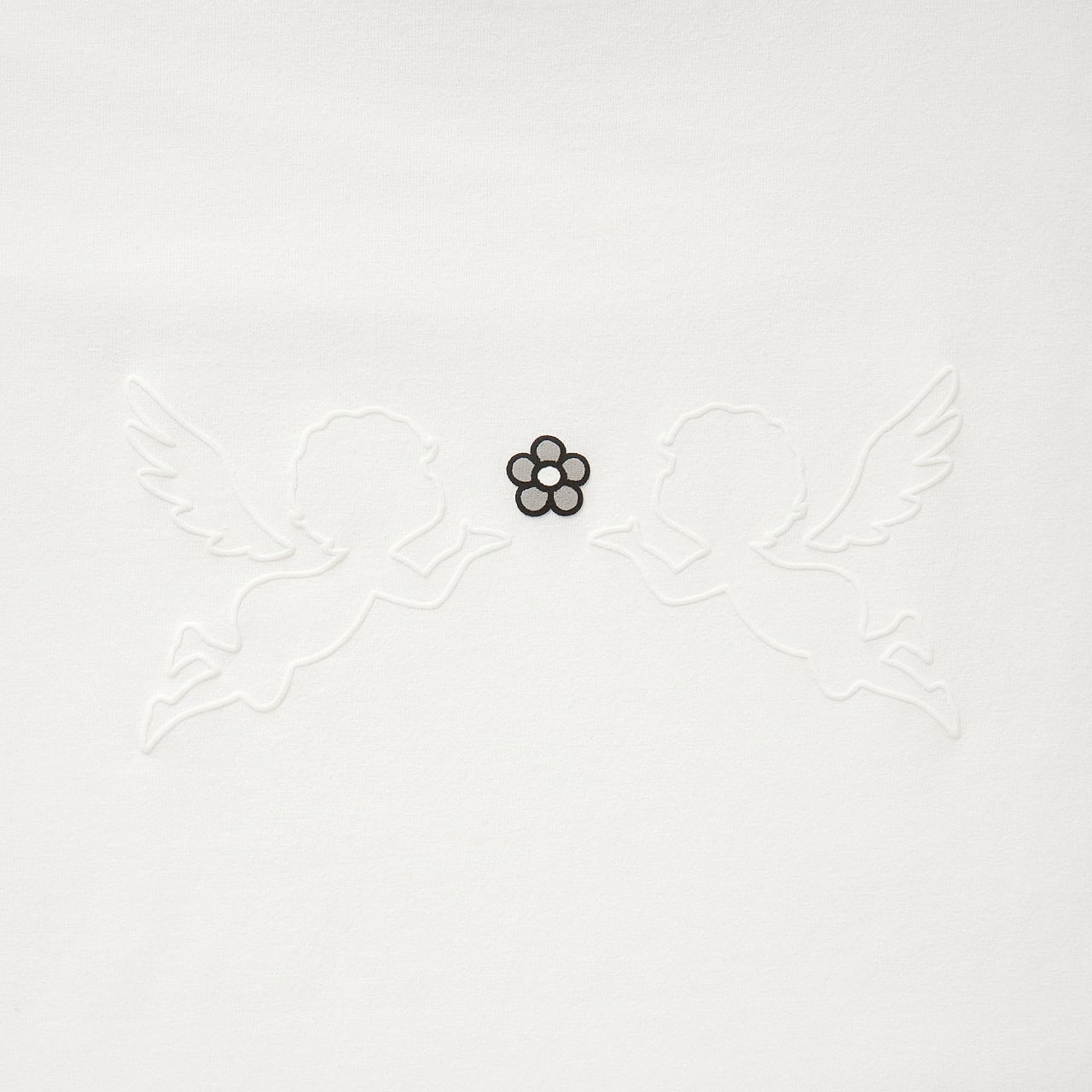 2体の天使と中央に配置されたフラワーが特徴的なTシャツ。発泡プリントで立体的な肌触りも特徴です。ボディは程よくルーズシルエットかつ肉厚なヘビーウェイトを採用。 洗うごとに生地が育ちます。