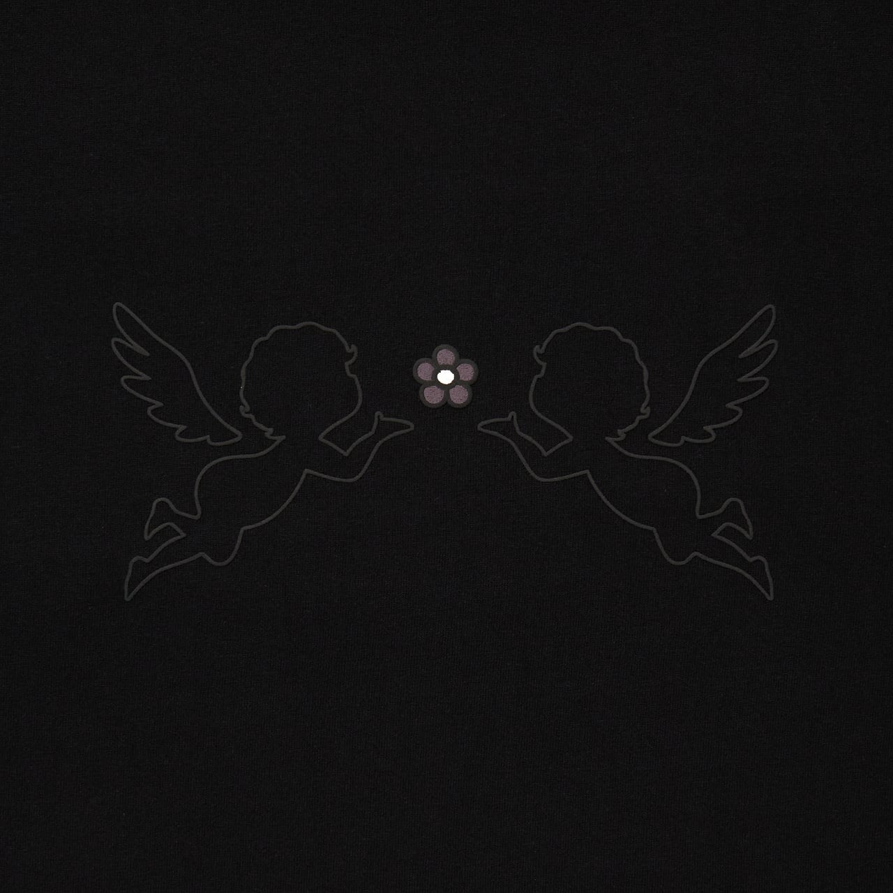 2体の天使と中央に配置されたフラワーが特徴的なTシャツ。発泡プリントで立体的な肌触りも特徴です。ボディは程よくルーズシルエットかつ肉厚なヘビーウェイトを採用。 洗うごとに生地が育ちます。