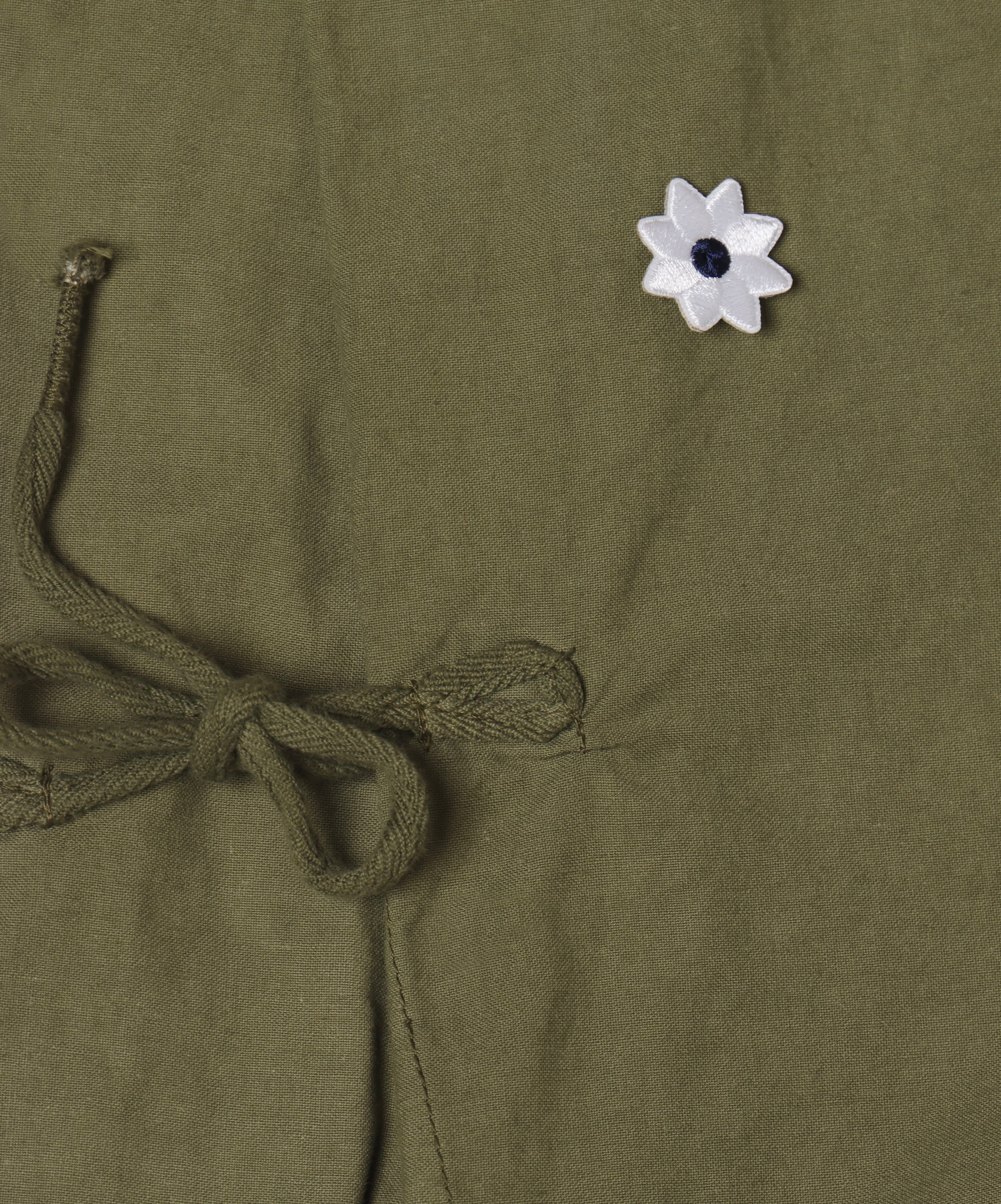 フラワーワッペンの真ん中部分のみを縫い付け周りは浮いた状態にしてあります。