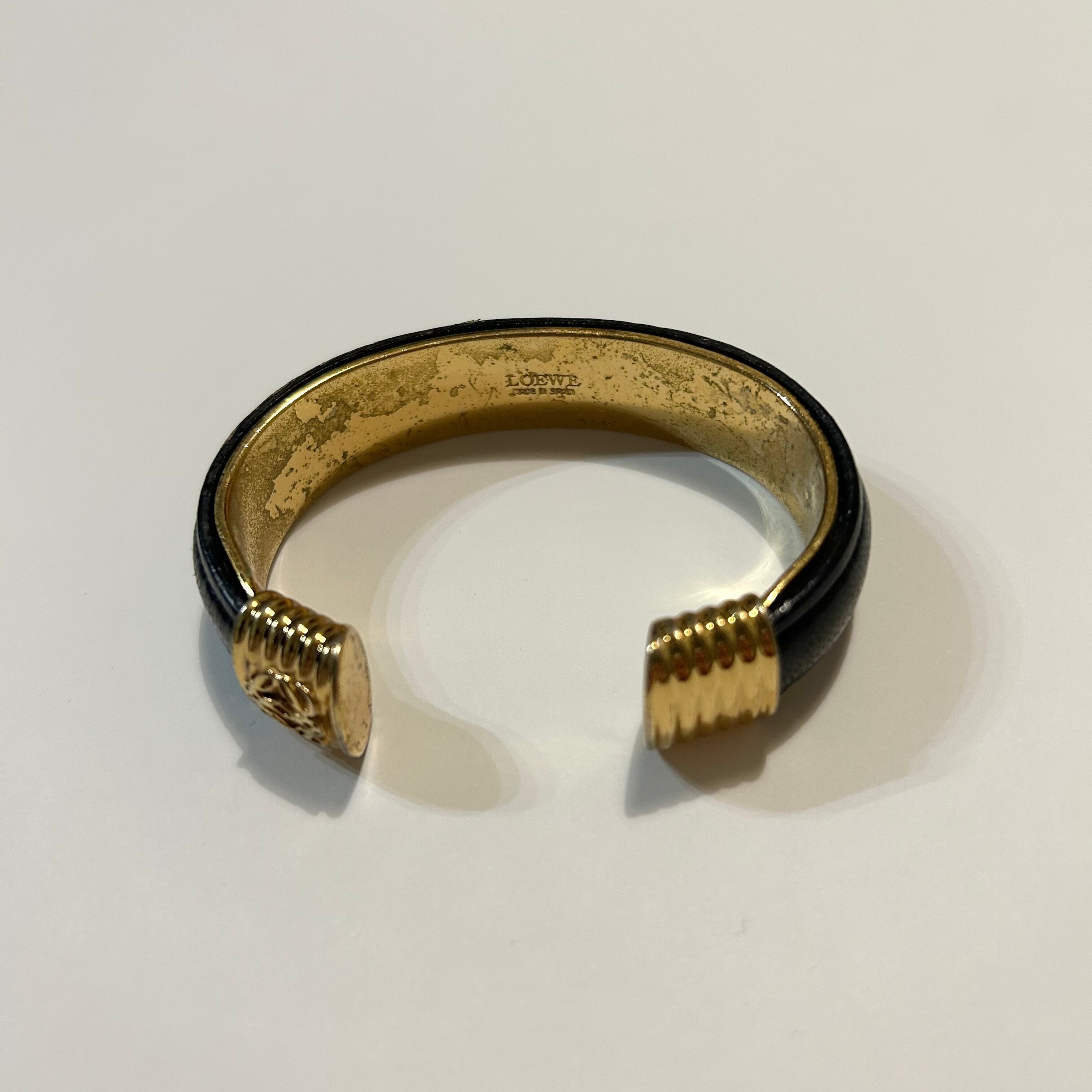 LOEWEのヴィンテージレザーブレスレット。こちらは80年代のものになります。ブラックレザーとゴールド(真鍮)の組み合わせが上品です。程よい重厚感があり質の良さがうかがえます。ロゴも当時のロゴで内側に刻印がございます。レザーや真鍮部分に傷など劣化が見られますが凄く良い味が出ています。バングルタイプですので多少の調節可能です。付属品こそありませんが中々見かけることがないので是非。