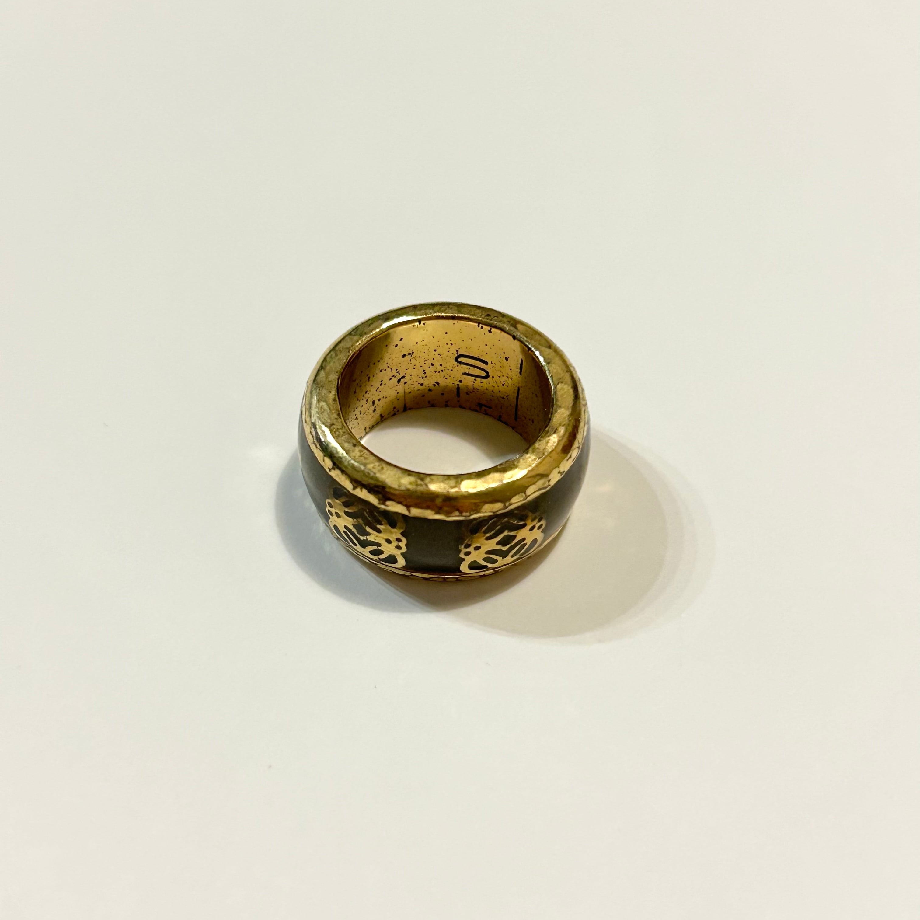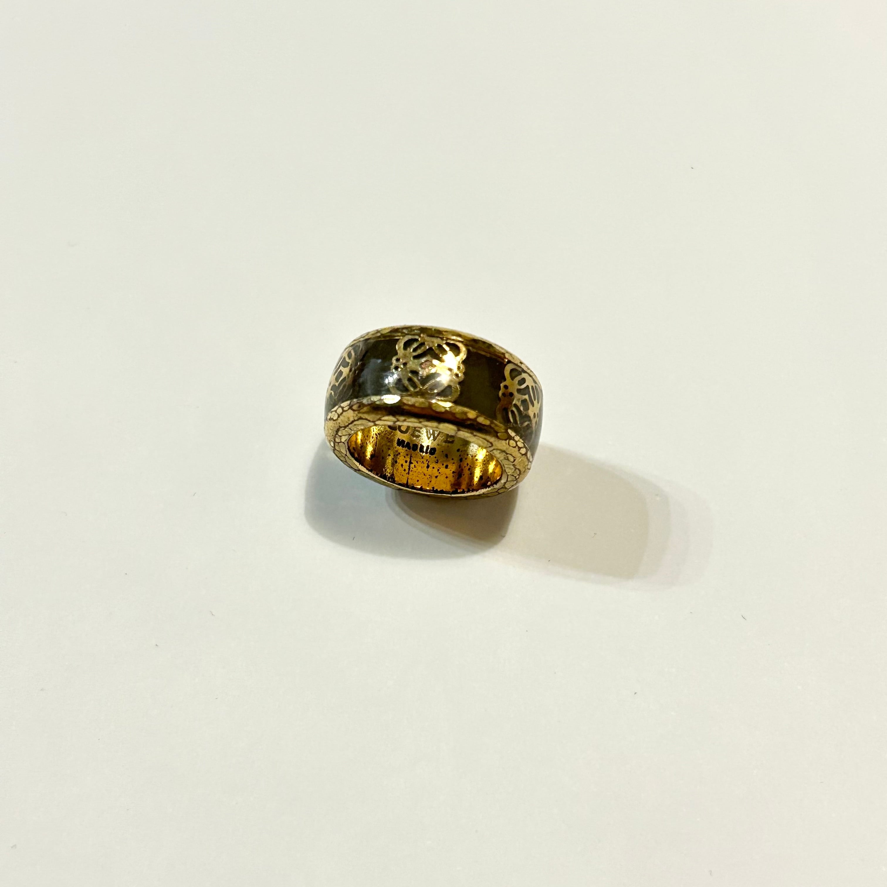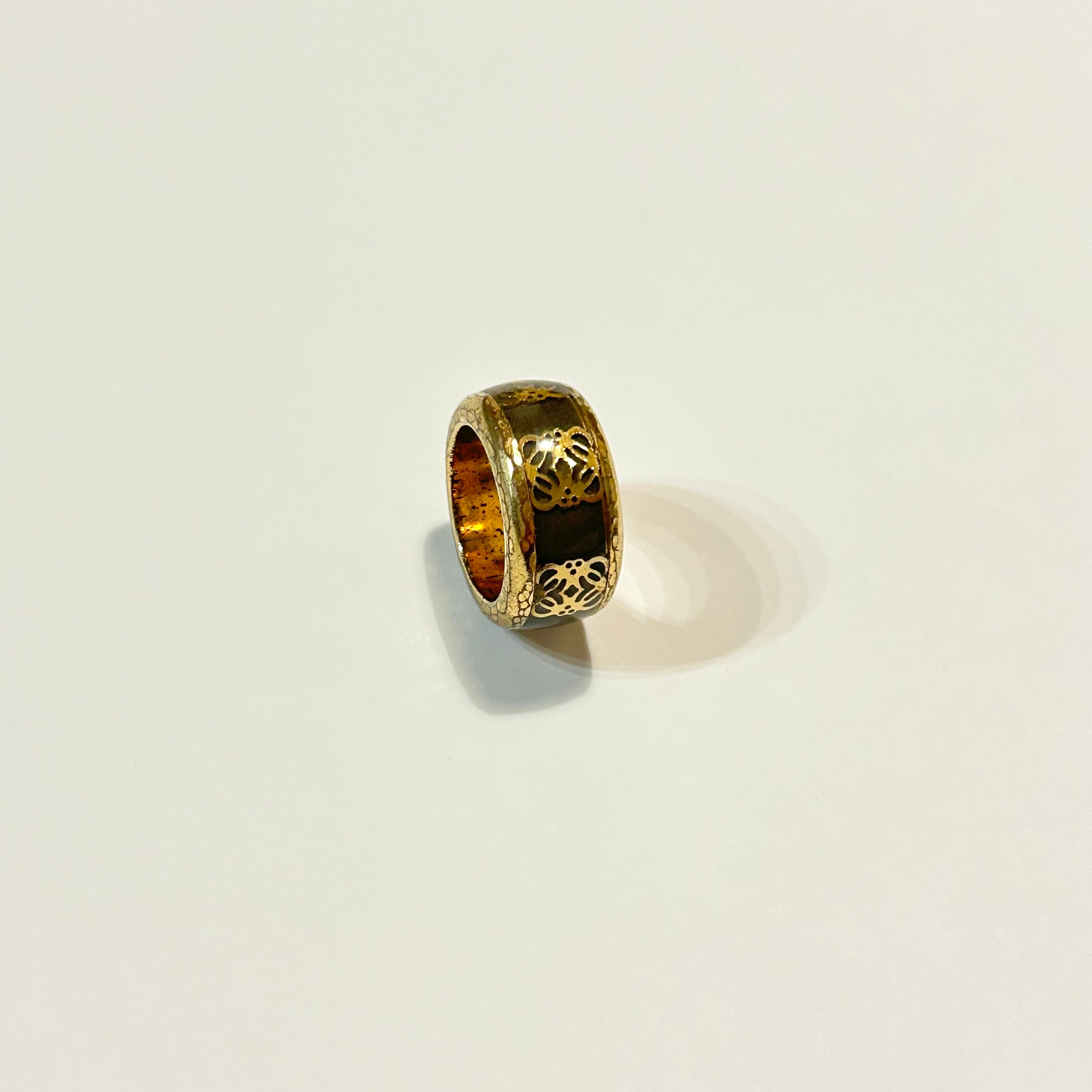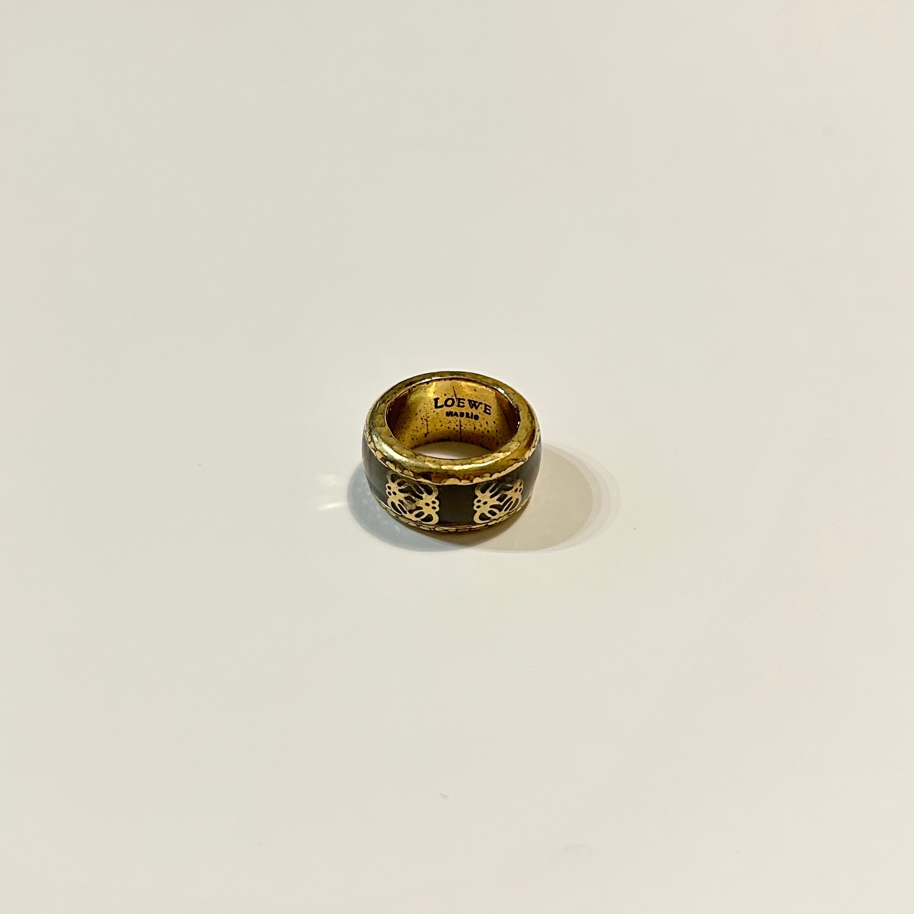 LOEWEのヴィンテージリング。おそらく80年代辺りのお品です。ゴールドの真鍮で当時の旧ロゴが配置されています。本体はグレーブラウンでかなり絶妙な配色でみるからに高級感が窺えます。全体的に傷などの劣化がありますが凄く良い味が出ています。付属品こそありませんが中々見かけることがないので是非。